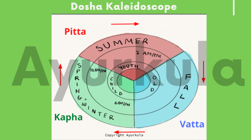 Spring and winter are Kapha dominant, summer is Pitta dominant, and the windy Fall is Vatta dominant. Generally, Ayurveda advises people to follow a lifestyle in tune with the seasons.